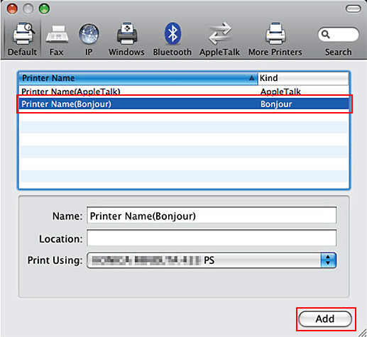 Sélectionnez le nom du modèle souhaité connecté Bonjour dans la liste [Printer Name].