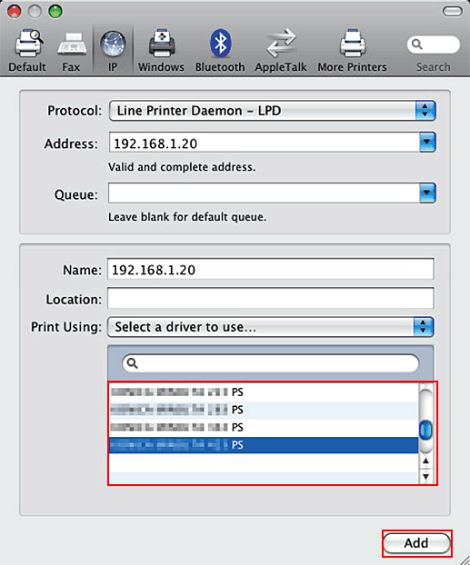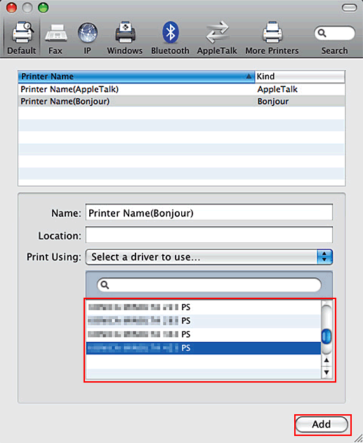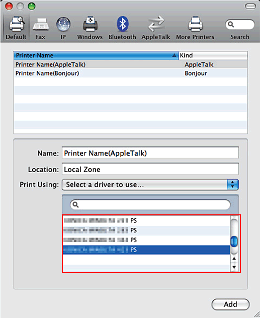 Sous OS X 10.6/10.7/10.8, sélectionnez [Select Printer Software ] dans [Driver] et sélectionnez le pilote d'imprimante du nom de modèle souhaité dans la liste qui s'affiche dans la fenêtre séparée.