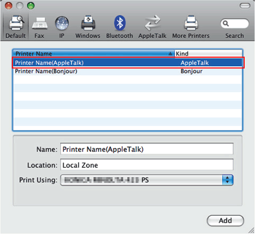 Sélectionnez le nom du modèle souhaité connecté AppleTalk dans la liste [Printer Name].