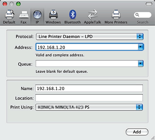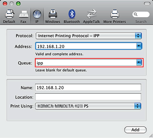 Dans [Address], entrez l'adresse IP de la machine. Dans [Queue], entrez "ipp".