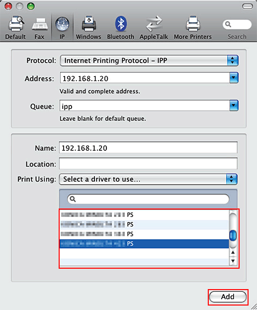 Sous OS X 10.5, sélectionnez [Select a driver to use] dans [Driver] et sélectionnez le pilote d'imprimante du nom de modèle souhaité dans la liste.