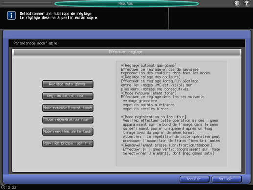 Procédez aux réglages en modes Réglage gamma automatique, Réglage calage couleur, Renouvellement toner, Régénération four, Renvllem.unité tamb. et Renvllem.brosse lubrific.