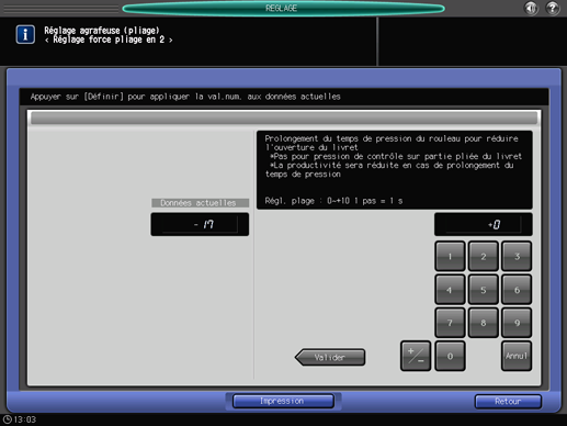 Réglage du temps de pression du rouleau au point de pliage du livret en mode Pliage & Agrafage, ou Pliage en deux multiple de la piqueuse à cheval SD-510 installée sur l'unité de finition FS-532. La valeur entrée représente le nombre de secondes. Rallonger la durée du pression du rouleau augmente la force pour plier les livret mais réduit la productivité.