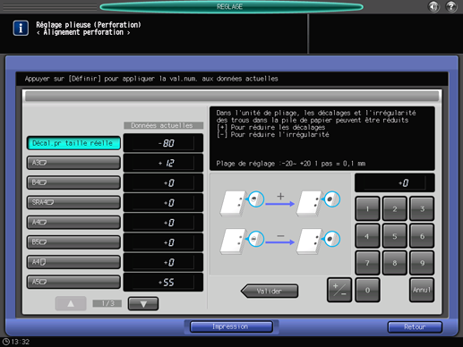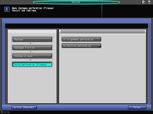 Appuyez successivement sur [Réglages finition], [Réglage plieuse], [Unité perforation (Plieuse)] et [Alignement perforation].