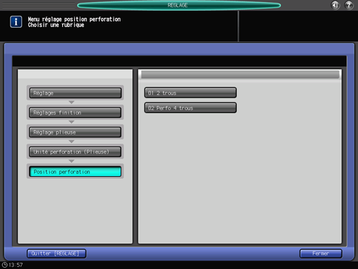 Appuyez successivement sur [Réglages finition], [Réglage plieuse], [Unité perforation (Plieuse)] et [Position perforation].