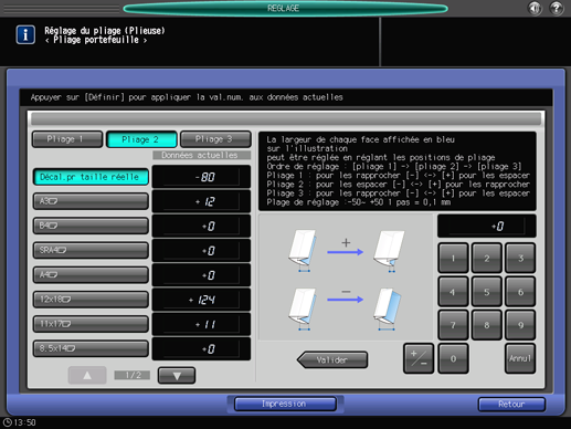 Sélectionnez [Pliage 2] et utilisez le clavier de l'écran tactile pour entrer la valeur de réglage.