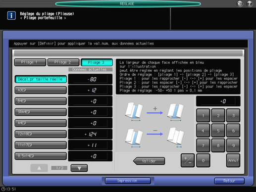 Sélectionnez [Pliage 3] et utilisez le clavier de l'écran tactile pour entrer la valeur de réglage.