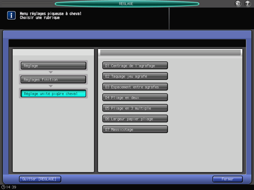 Appuyez successivement sur [Réglages finition], [Réglage unité piqûre cheval] et [Pliage en 3 multiple].