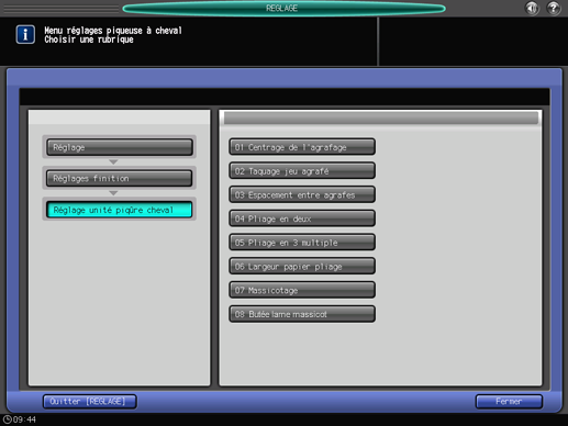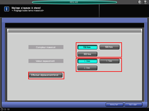 Appuyez successivement sur [Réglages finition], [Réglage unité piqûre cheval] et [Butée lame massicot].