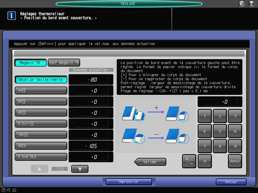 Appuyez successivement sur [Réglages finition], [Thermorelieur] et [Position bord avant couvert.].