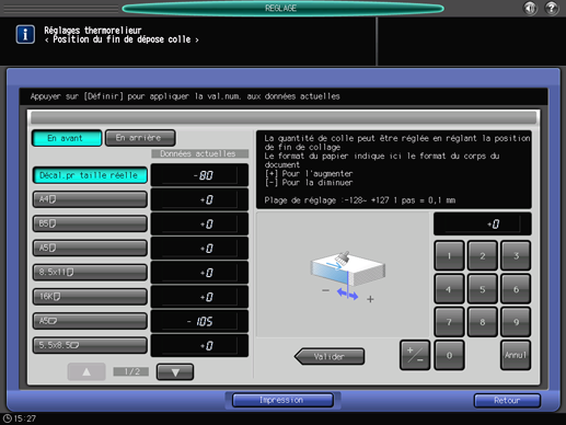 Appuyez successivement sur [Réglages finition], [Thermorelieur] et sur [Position fin dépose colle].