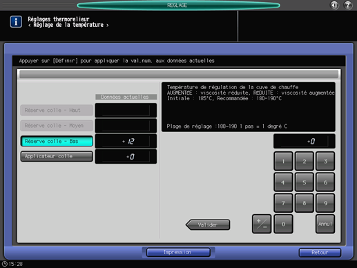 Ce réglage permet de contrôler l'état de la colle à sécher en agissant sur la température des capteurs situés à l'intérieur de la réserve chauffante et sur celle de l'applicateur de colle du Thermorelieur PB‑503.