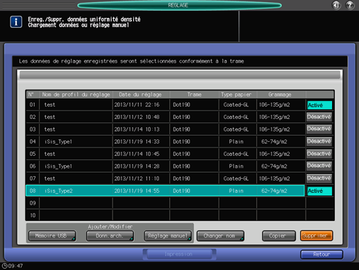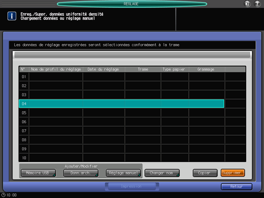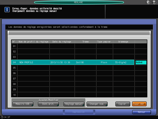 L'écran [Enreg./Suppr. données uniformité densité] s'affiche indiquant le nom de profil du réglage (22 caractères max. d'informations personnalisées par l'utilisateur) spécifié à l'étape 2.