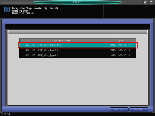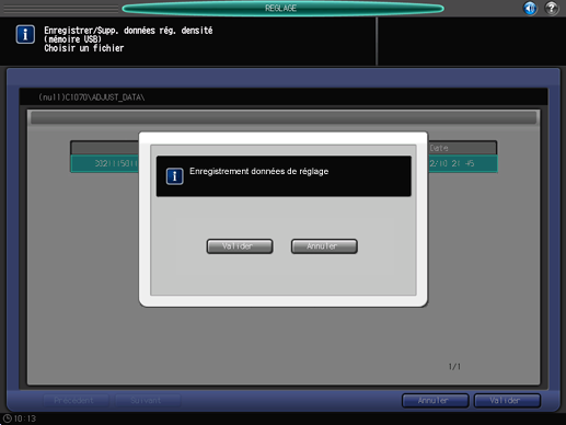 Le nom de fichier des données de mesure s'affiche sur l'écran Enregistrement/Suppression des données de réglage uniformité densité.