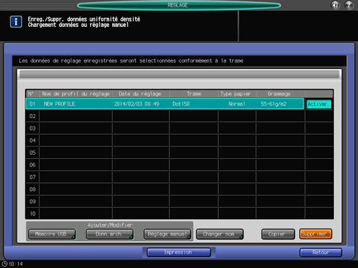 L'écran [Enreg./Suppr. données uniformité densité] est affiché.