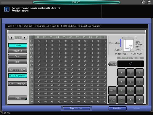 Pour le réglage manuel du réglage de l'uniformité de la densité, les deux modes suivants, [Tous x 9 points] et [16 x 32 points] sont disponibles.