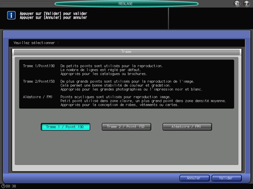 Si les données à modifier sont les données colorimétriques mesurées avec le spectrophotomètre, le type de trame n'est pas modifiable. La touche [Trame] est estompée et inactive.