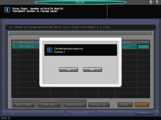 La sélection de la touche [Supprimer] affiche l'écran de confirmation. La sélection de la touche [Oui] supprime la rangée sélectionnée.