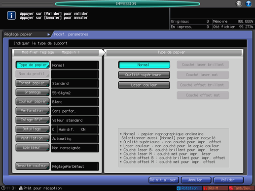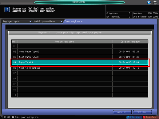 Appuyez sur [Valider] sur l'écran [Modif. paramètres] pour revenir à l'écran [Réglage papier].