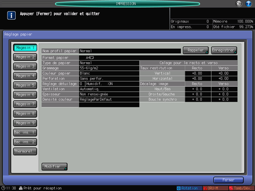 Appuyez sur l'onglet [Réglage papier] de l'écran [IMPRESSION] pour afficher l'écran [Réglage papier] et appuyez sur [Modifier].