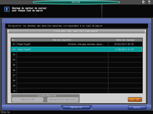 Appuyez sur le bouton [Mémoire USB] de l'écran [Réglage du capteur de couleur pour chaque type de papier].