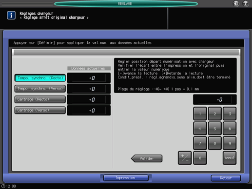 Objets de réglage : Tempo synchro (Recto), Tempo synchro (Verso), Centrage (Recto), Centrage (Verso)
