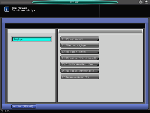 Appuyez sur [Réglage] sur l'écran [MACHINE] pour afficher l'écran [Menu réglages].