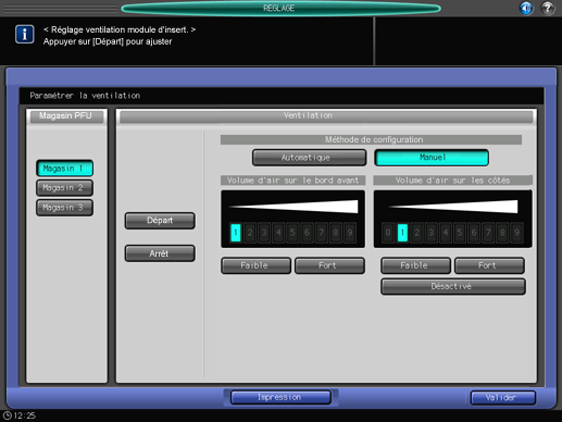 N'ouvrez pas la fenêtre de confirmation buse d'air des magasins 1, 4 et 7. Pour effectuer les réglages de ventilation des magasins 1, 4 et 7, configurez manuellement les réglages d'un magasin autre que ces trois-là, puis définissez la même valeur de réglage.