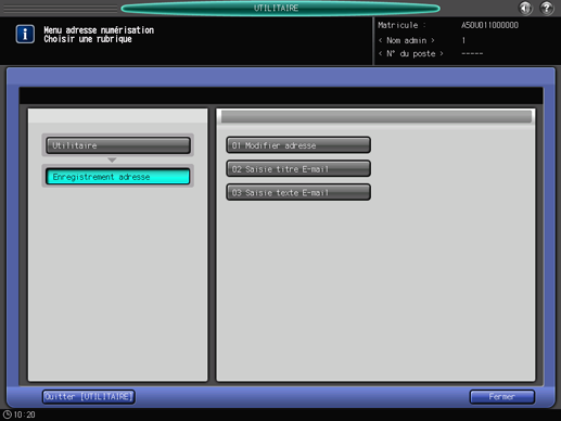 Pour revenir à la hiérarchie du menu [UTILITAIRE], appuyez sur [Fermer] ou sélectionnez un niveau sur le côté gauche de l'écran.