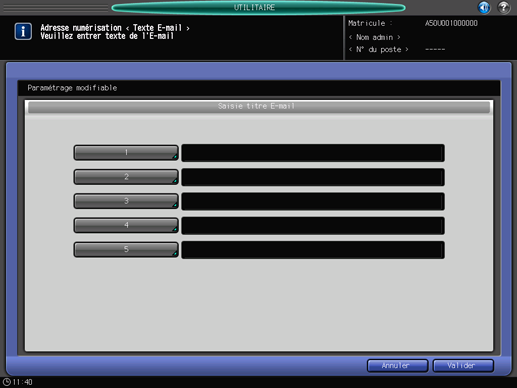 Sur l'écran [Menu adresse numérisation], vous pouvez spécifier les éléments [Modifier adresse], [Saisie titre E-mail] et [Saisie texte E-mail]. L'envoi d'e-mails est facilité par l'enregistrement des objets et messages fréquemment utilisés.