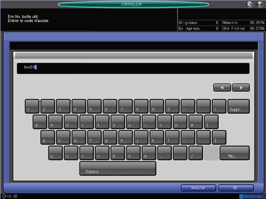 Vous pouvez supprimer une boîte utilisateur ou en modifier les informations dans[Contrôleur] sous [Réglage administrateur]. Pour en savoir plus, voir Paramètres boîte : enregistrement, modification et suppression d'une boîte utilisateur.