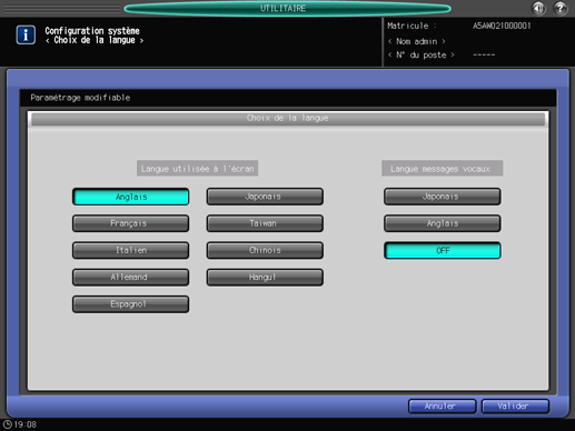 Sélectionnez la langue souhaitée parmi les touches situées sous [Langue utilisée à l'écran].