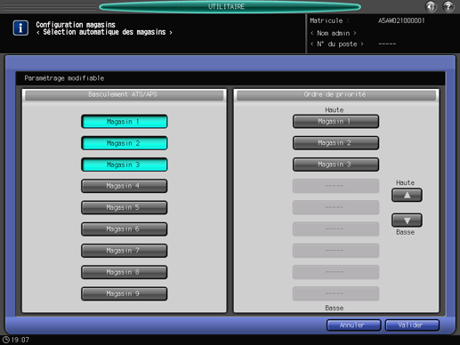A l'aide des boutons situés sous [Basculement ATS/APS], sélectionnez le magasin d'alimentation papier utilisé par la fonction APS et le magasin de remplacement pour la fonction ATS.