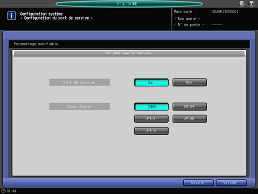 Spécifiez si vous souhaitez utiliser ou non un port de service (port USB). Sélectionnez aussi le type de clavier si le port de service est utilisé.