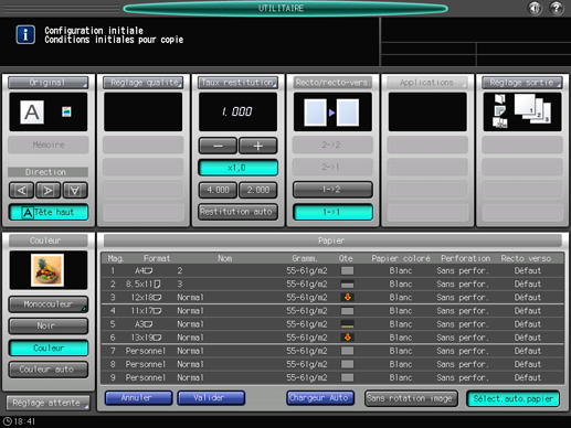 Vous pouvez définir les réglages par défaut de l'écran [COPIER] qui sont appliqués lorsque la machine est réinitialisée. Pour activer cette fonction, sélectionnez [Conditions init.] pour la [Fonction touche Auto] de [Réglage réinitialisation tâche].