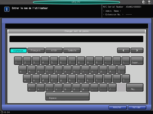 Les utilisateurs peuvent changer le code qu'un administrateur a fixé en même temps qu'un nom d'utilisateur (code d'utilisateur). Le mot de passe modifié ici est utilisé dans l'authentification utilisateur.