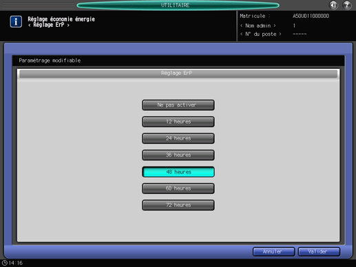 Sélectionnez le laps de temps après expiration duquel la fonction ErP sera activée. Sélectionnez [Ne pas activer] si vous souhaitez désactivez la fonction ErP.