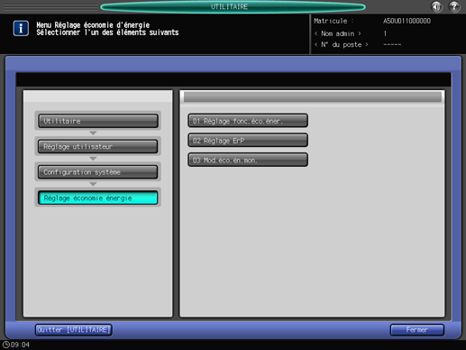 Appuyez successivement sur [Configuration système] sur l'écran [Menu fonctions administrateur] et appuyez sur [Réglage économie énergie] et [Réglage ErP].