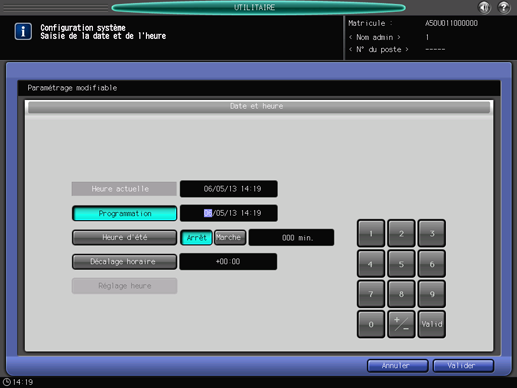 Pour les opérations subséquentes, suivez la même procédure que dans [Réglage utilisateur] - [Configuration système] - [Date et heure]. Pour en savoir plus, voir Réglage date/heure : réglage de la date et de l'heure.