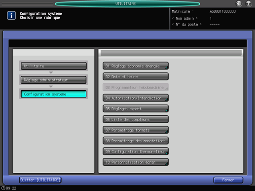 Appuyez sur l'onglet [Configuration système] de l'écran [Menu fonctions administrateur] et appuyez sur [Date et heure].