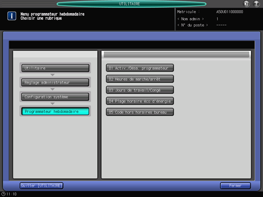 Le Programmateur hebdomadaire est une fonction de gestion accessible dans Réglage administrateur, et qui permet d'éteindre la machine quotidiennement ou à certaines heures.