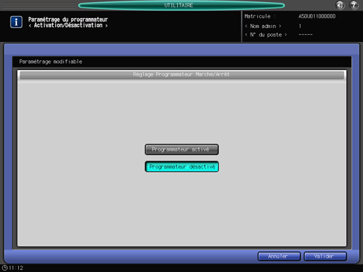Appuyez successivement sur [Configuration système] sur l'écran [Menu fonctions administrateur] et appuyez sur [Programmateur hebdomadaire] et [Activ./Désa. programmateur].