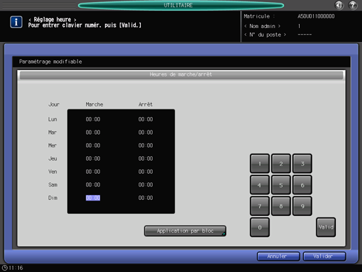Utilisez le clavier de l'écran tactile ou le clavier du panneau de contrôle pour entrer les heures de marche/arrêt. Appuyez sur [Valid] pour décaler la zone mise en évidence.