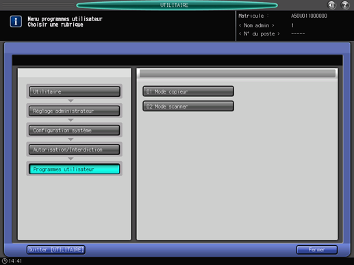 Appuyez sur l'onglet [Configuration système] de l'écran [Menu fonctions administrateur]. Appuyez successivement sur [Autorisation/Interdiction], [Programmes utilisateur] et [Mode copieur].