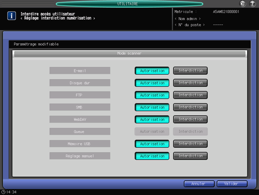 Appuyez successivement sur [Configuration système], [Autorisation/Interdiction] et [Mode scanner].