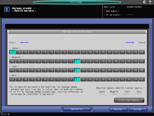 Lorsque la sortie des chartes est terminée, l'écran Réglage densité maximale réapparaît et le résultat de mesure est affiché sous "Résultat mesure densité (valeur approx.)" dans la partie inférieure droite de l'écran.