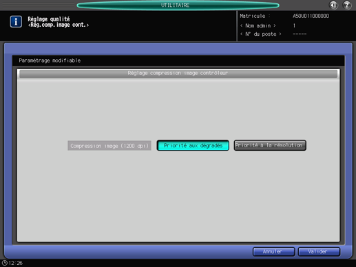 Appuyez sur [Configuration système] sur l'écran [Menu fonctions administrateur] et appuyez successivement [Réglages expert], [Réglage qualité] et [Compression image contrôleur].