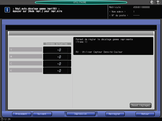 Appuyez sur [Configuration système] sur l'écran [Menu fonctions administrateur] et appuyez successivement [Réglages expert], [Réglage qualité] et [Décalage gamma impr.auto(RU)].