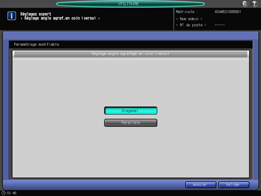 Appuyez sur l'onglet [Configuration système] de l'écran [Menu fonctions administrateur], puis consécutivement sur [Réglages expert] et [Angle agraf.en coin (verso) ].
