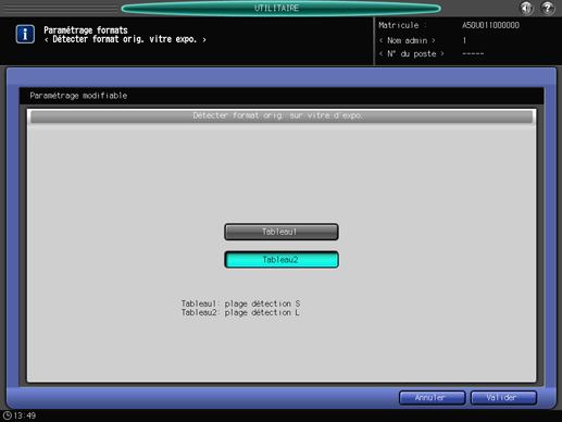 Appuyez sur l'onglet [Configuration système] de l'écran [Menu fonctions administrateur] et appuyez successivement sur [Paramétrage formats] et [Détect. format orig.sur vitre ].